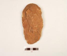 | Description / विवरण | A handaxe made on quartzite end struck flake, prepared paltform, flake scars on both sides, bi-convex in cross section and wavy working edge. |