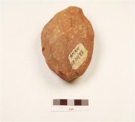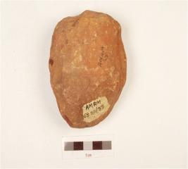 | Description / विवरण | A chopping tool made on quartzite pebble, bi-convex in cross section, flake scars on both sides and cortex partly intact on surface. |