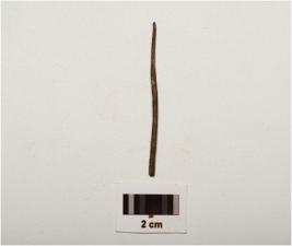 | Description / विवरण | Fragment of copper pin slightly flat both ends, thin in character and chemically treated. |