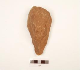 | Description / विवरण | A handaxe made on quartzite end struck flake, triangualr in cross section, wavy working edge and flake scars on both sides. |