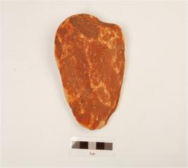 | Description / विवरण | A handaxe made on sandstone end struck flake, diffused bulb on ventral side, triangular in cross section and weathered surface. |