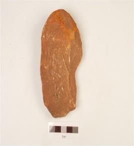 | Description / विवरण | A handaxe made on quartzite side struck flake, prepared platform, diffused bulb on ventral side, wavy working edge, bi-convex in cross section and weathered surface. |