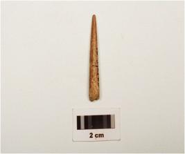 | Description / विवरण | Fragment of a bone with circular section one end is sharp pointed and other end is partly broken, well polished surface. |
