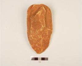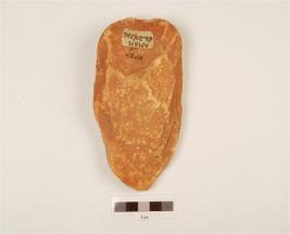 | Description / विवरण | A handaxe made on quartzite end struck flake, bi-convex in cross section, wavy working edge and flake scars on both sides. |