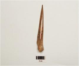 | Description / विवरण | A bone point, one end is sharp pointed and other end is flat and broad, groove on one side, well polished surface and brown in colour. |