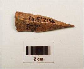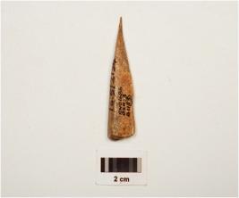 | Description / विवरण | A bone point, one end is pointed and other end is flat and broad, brown in colour and well polished. |