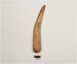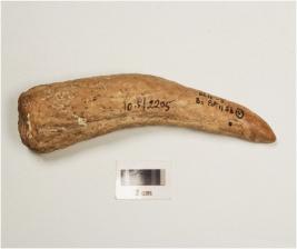 | Description / विवरण | Fragment of a point on horn with modifide and well polished surface, pointed one end, thicker and broken other end, brown in colour. |