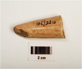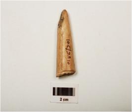 | Description / विवरण | Fragment of a point on horn with modifide well polished surface, chipped off near pointed end to give a chisel like edge, other end is thicker and partly broken. |