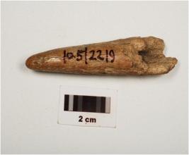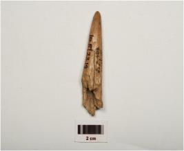 | Description / विवरण | Fragment of a point on horn with modifide and well polished surface, pointed towords one end, thicker and broken other end, brown in colour. |