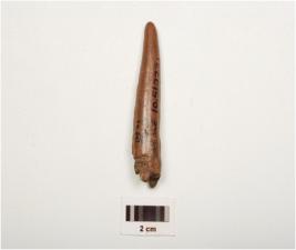 | Description / विवरण | Fragment of a point on horn with modifide and well polished surface, pointed towords one end, thicker and broken other end and brown in colour. |