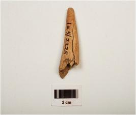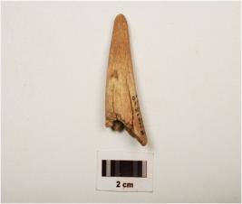 | Description / विवरण | Fragment of a point on horn with modifide and well polished surface, pointed towords one end, thicker and broken other end, brown in colour. |