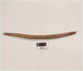 | Description / विवरण | A bone point mended pointed both end, flat both surface, slightly bent on middle, rough and polished surface. |