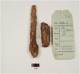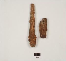| Description / विवरण | Fragment of iron nail, long in size with rough surface, knob-head, crack marks, square in cross section and rusted. |