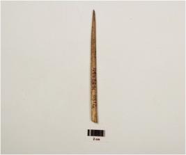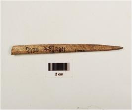| Description / विवरण | Fragment of a chisel on horn with modifide well polished surface, chipped off near pointed end to give a chisel like edge, thicker and broken other end. |