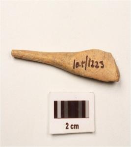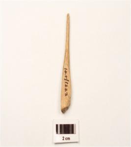 | Description / विवरण | A bone point fragment with smooth surface, slightly broken from pointed end with long narrow surface. |