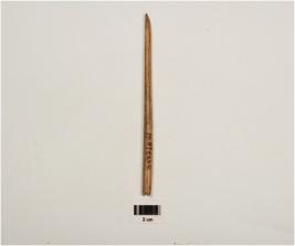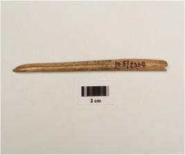| Description / विवरण | A bone point, polished surface with vertical crack marks one pointed end, partly broken from other end, cream in colour and light brown in colour. |