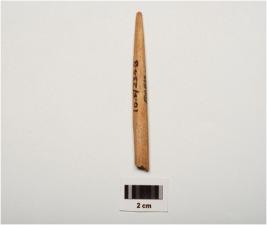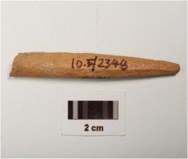 | Description / विवरण | A bone point with grains on smooth surface, one slightly broken pointed end, partly broken from other end, light brown in colour and rectangular in section. |
