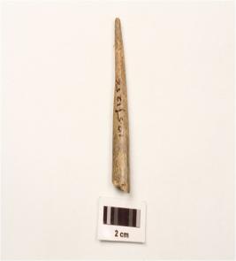 | Description / विवरण | A fragment of bone point, deep cracks on smooth surface, slightly broken from pointed end. |