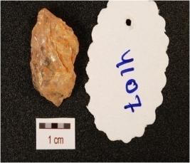 | Description / विवरण | A utilized flake, made on quartz with flake scars on dorsal, prepared platform and use wear marks on edge. |