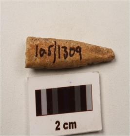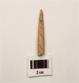 | Description / विवरण | A bone point fragment with broken pointed end, incised marks on surface. |
