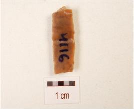 | Description / विवरण | Fragment of a blade, made on chert with double ridge on dorsal side, trapezoid in section and use-wear marks on cutting edge, partly chipped off on dorsal side. |
