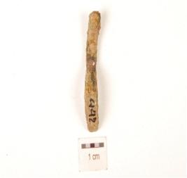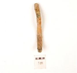 | Description / विवरण | A copper nail, rough surface, broken from both ends, rectangular in cross section and slightly curved. |