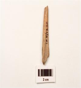 | Description / विवरण | A bone point fragment with smooth surface, partly broken from pointed end with long narrow other end. |