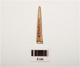 | Description / विवरण | Bone point with polished surface, slightly broken at pointed end and rectangular cross section. |