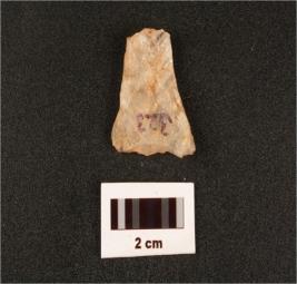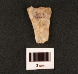 | Description / विवरण | A quartz flake with one flake scars on surface, diffused bulb on one side. |