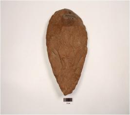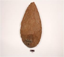 | Description / विवरण | Hand axe, made on a quartzite pebble, cortex on butt-end, sharp cutting edges forming pointed end and flake scars on both sides. |