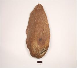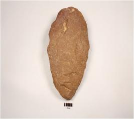 | Description / विवरण | Hand Axe, made on a quartzite pebble, flake scars on dorsal and ventral sides, sharp along both latral edges and thick butt end. |