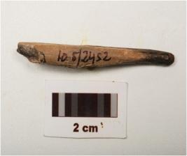 | Description / विवरण | Fragment of a charred bone point with a pointed end, smooth surface with crack marks, partly broken from other end, light brown in colour and oval in section. |