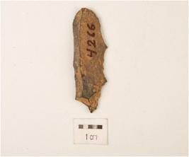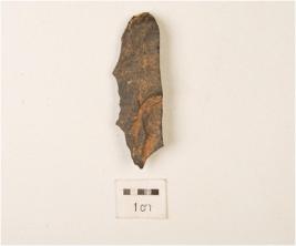 | Description / विवरण | A parallel sided blade made on chert, mid-ridge on dorsal surface, difused bulb, irregular cutting edges. |