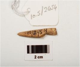 | Description / विवरण | Fragment of a bone point, smooth surface with a pointed end, partly broken from other end, light brown in colour and rectangular in section. |