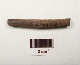 | Description / विवरण | Fragment of a point made on charred bone, smooth surface broken from both ends, dark grey in colour and square in section. |