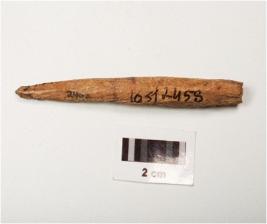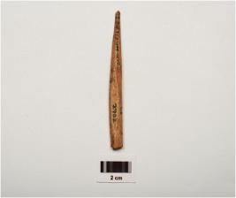 | Description / विवरण | A bone point with polished surface and one pointed end partly broken from ends, light brown in colour and oval in section. |