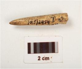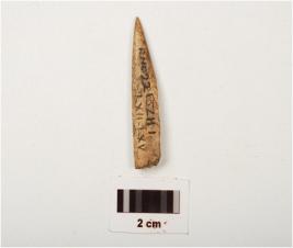 | Description / विवरण | Fragment of a bone point, smooth surface with a pointed end, partly broken from other end, light brown in colour and rectangular in section. |
