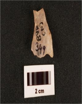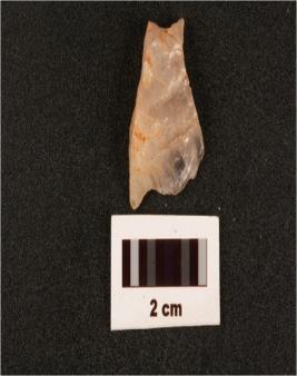 | Description / विवरण | A quartz end scraper made on side struck flake, two blade scars on dorsal side, use wear marks on cutting edges. |
