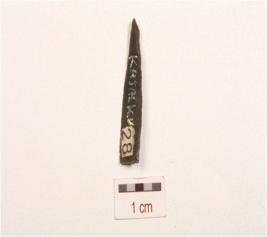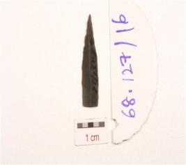 | Description / विवरण | Fragment of chert point, use wear marks along cutting edges, pointed distal end, prominent ridge on dorsal surface and triangular cross section. |