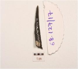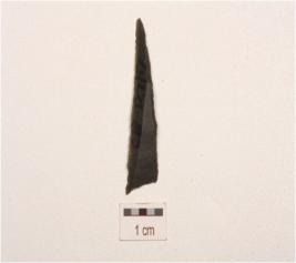 | Description / विवरण | Fragment of backed blade, made on chert, use wear marks along cutting edges, a prominent ridge on surface and triangular cross section. |