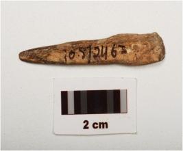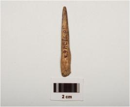 | Description / विवरण | Fragment of a bone point, polished surface with a pointed end, parlty broken from other end, light brown in colour and rectangular in section. |