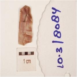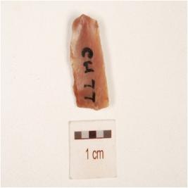 | Description / विवरण | A blade made by chert, prominent bulb on ventral side and flake scars on the dorsal side, prepared platform on the proximal end and partly retouching on the cutting edges. |