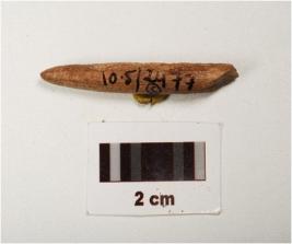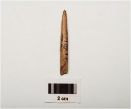 | Description / विवरण | Fragment of a bone point, polished surface one pointed end partly broken from other end, brown in colour and circular in section. |