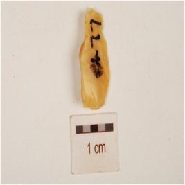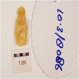 | Description / विवरण | A chert balde, prominent bulb on ventral side and flake scars on dorsal side, prepared platform on proximal end, use wear marks on cutting edges and distal end pointed. |