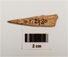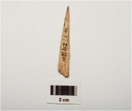| Description / विवरण | Fragment of a bone point, polished surface with a pointed end, partly broken from other end and rectangular in section. |