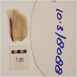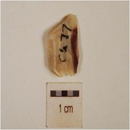| Description / विवरण | A chert scraper made on side struck flake, prominent bulb on ventral side and flake scars on dorsal side, use wear marks on cutting edges. |