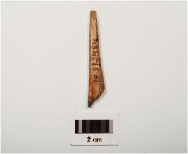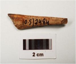 | Description / विवरण | Fragment of a bone point, polished surface with partly broken both ends, brown in colour and square in section. |