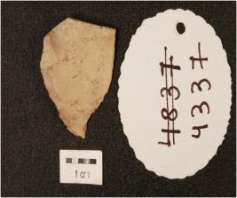 | Description / विवरण | A chert end scraper made on end struck flake, prominent bulb at ventral side, prepared platform. |
