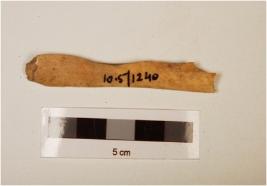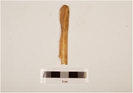 | Description / विवरण | Fragment of bone point, slightly uneven in shape, flat from inside, ridge on other side, broken from bottom and polished surface. |