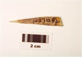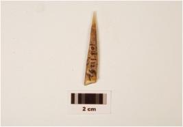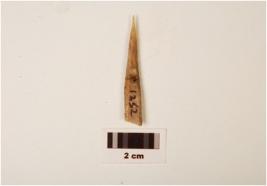 | Description / विवरण | Fragment of bone point, pointed top, broken from bottom, slightly flat surface and manded from middle, rough surface, polished tip. |
